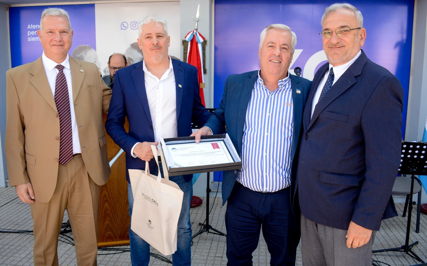 Los doctores Paul Schvarzstein, Guillermo Figueroa y Jorge Bertram, reciben una plaqueta de parte del Intendente Municipal, Leonardo Viotti